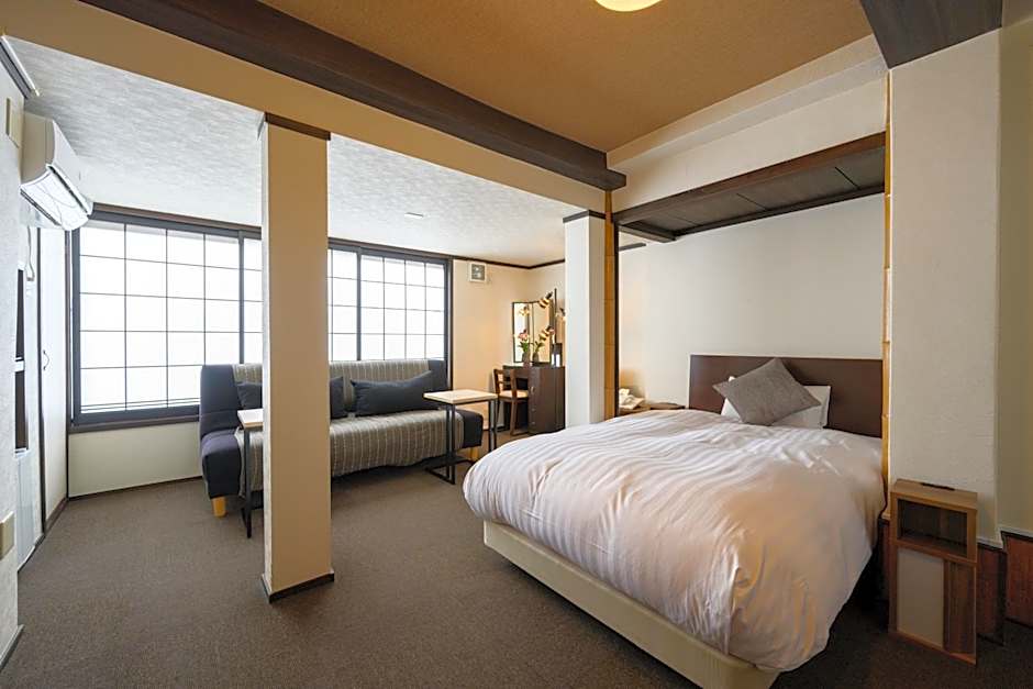 Comfortable room with a modern Japanese interior, featuring carpeting, a 47 in wide bed and a flat-screen TV. Amenities include a fridge and a personal safe. An attached toilet and a washstand are provided, while bathing facilities are shared.