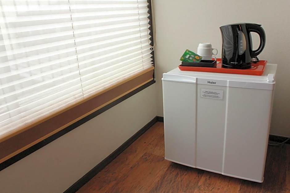 Comfortable room with a modern Japanese interior, featuring carpeting, twin beds and a flat-screen TV. Amenities include a fridge and a personal safe. An attached toilet and a washstand are provided, while bathing facilities are shared.