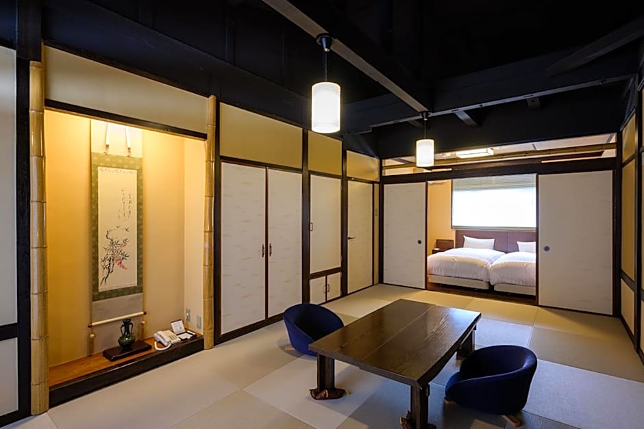 Room with a modern Japanese interior and twin beds. It comes with a Japanese-style seating area with a tatami (woven-straw) floor, where guests can sleep in traditional futon bedding. Amenities include a flat-screen TV, a fridge and a personal safe. An attached toilet and a washstand are provided, while bathing facilities are shared.