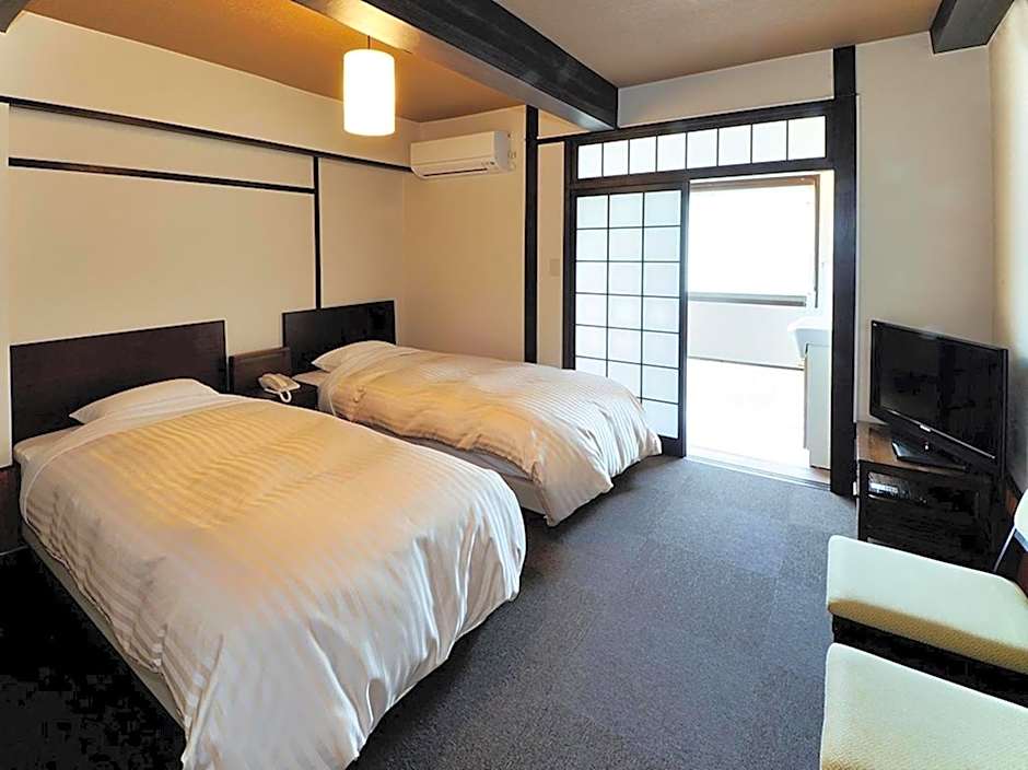 Comfortable room with a modern Japanese interior, featuring carpeting, twin beds and a flat-screen TV. Amenities include a fridge and a personal safe. An attached toilet and a washstand are provided, while bathing facilities are shared.